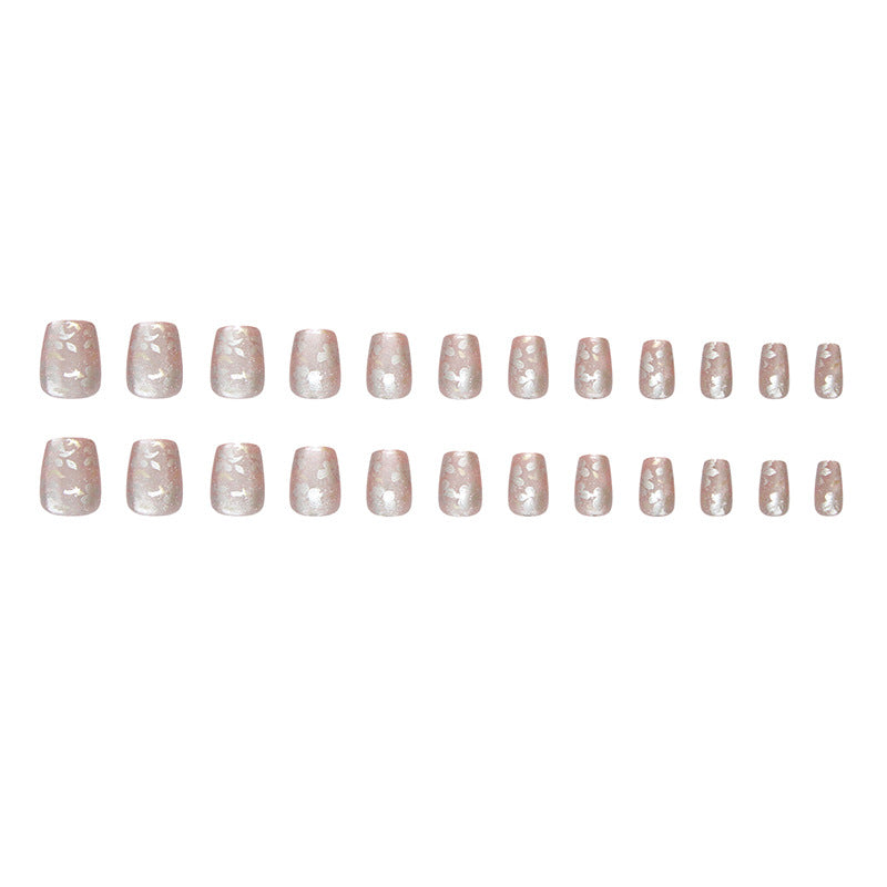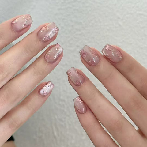 Embrace soft femininity and effortless beauty with "Blossom Glow", a set of shimmering floral press-on nails that bring romance and sophistication to your manicure. With its soft pink hues, pearlescent glow, and delicate floral details, this set is perfect for those who love a subtle yet enchanting nail design.