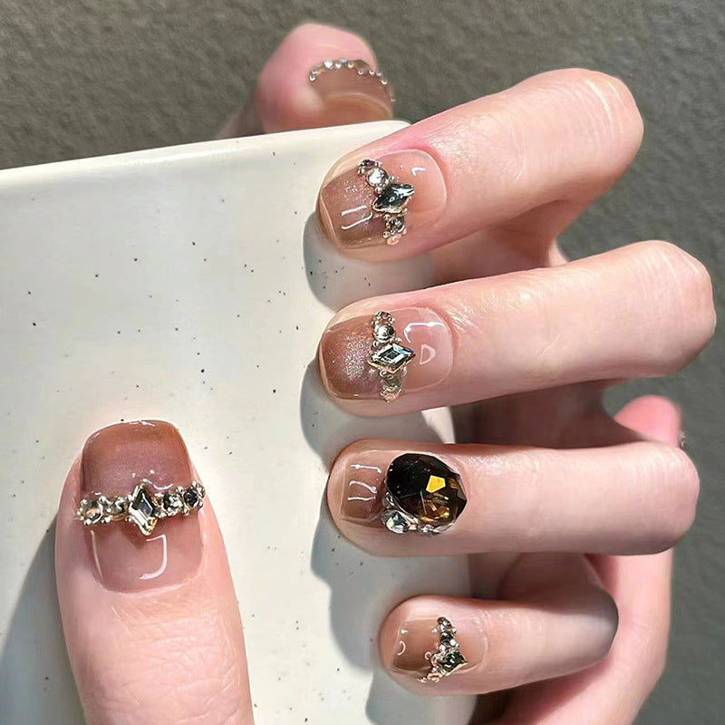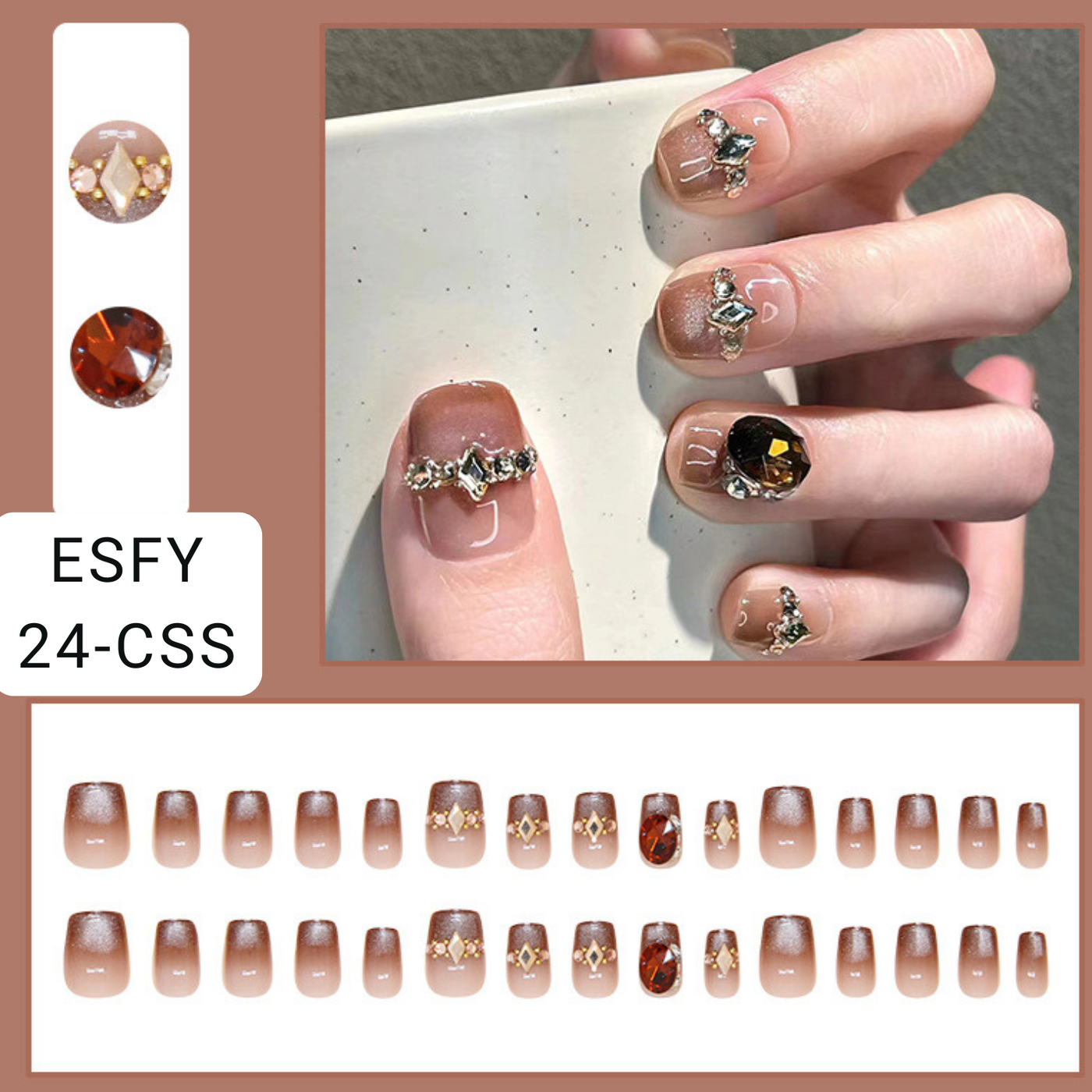 ESFY Perfect Press-On Nails – Sophisticated Brown & Gold Jewel Accents